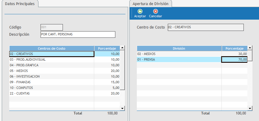 Para determinados gastos que se distribuyen de manera particular y luego el mismo criterio se utiliza en forma reiterativa, se brinda la posibilidad de registrar los criterios de distribución bajo el nombre de “Códigos de Apertura”, seleccionando las divisiones (unidades de negocios) y/o centros de costos involucrados para asignar un porcentaje de distribución.