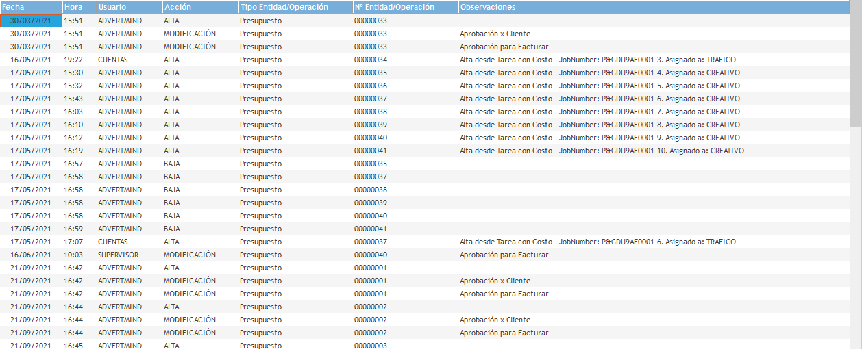 La información que se expone muestar los datos solicitados con el detalle de la hora de la acción, la acción (alta, baja, eliminación) y observaciones en general.