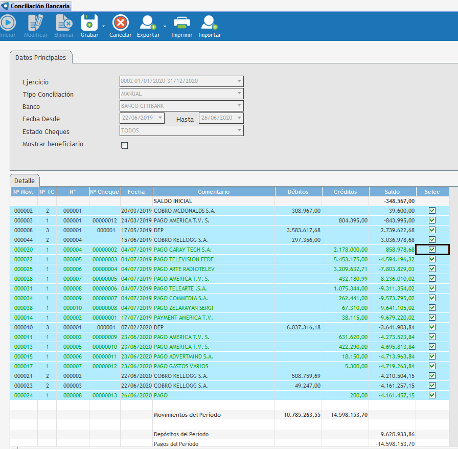 Cuando se inicie el listado el sistema mostrará todos los movimientos como conciliados, porque estos movimientos fueron generados en el sistema, por lo cual, entiende que ingresaron en el banco. Como forma de uso sugerimos destildar todos (hacer un clic con botón izquierdo sobre el título) y con el extracto bancario comenzar a tildar los movimientos que hayan ingresado. ![]() A medida que se selecciona un movimiento se actualiza el saldo que debe coincidir con el extracto.