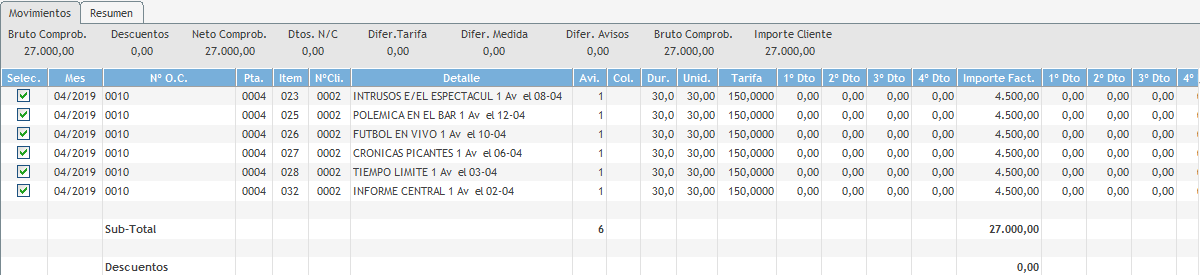 Una vez que hemos seleccionado los avisos, debemos dirigirnos a la Solapa Resumen donde se verá un detalle de lo seleccionado y se le incorporará los impuestos.