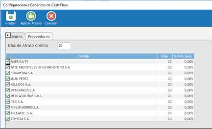 Al presionarlo se abre la ventana Configuraciones del Cash Flow Actual, allí se puede realizar, en forma unitaria, o incorporar, sobre la parte superior, la cantidad de días y aplicarlos a todos los Clientes seleccionados; el mismo proceso se realiza para proveedores.