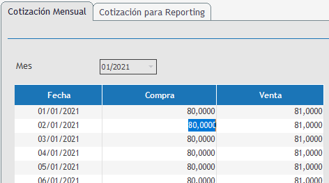 En esta opción se debe actualizar y/o ingresar las cotizaciones de las diferentes monedas controladas, la carga diaria la solicita el sistema a la persona que fue asignada para el ingreso de la cotización.