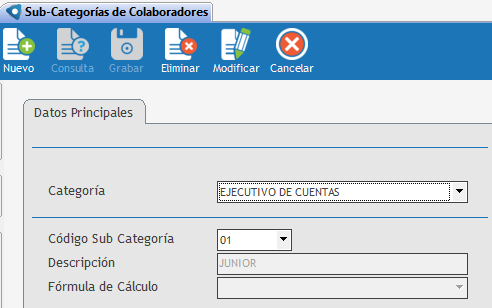 En esta opción se debe definir uno de los datos administrativos/contables del Colaborador tal como la SubCategoría asociada a la Categoría que corresponde a su función.