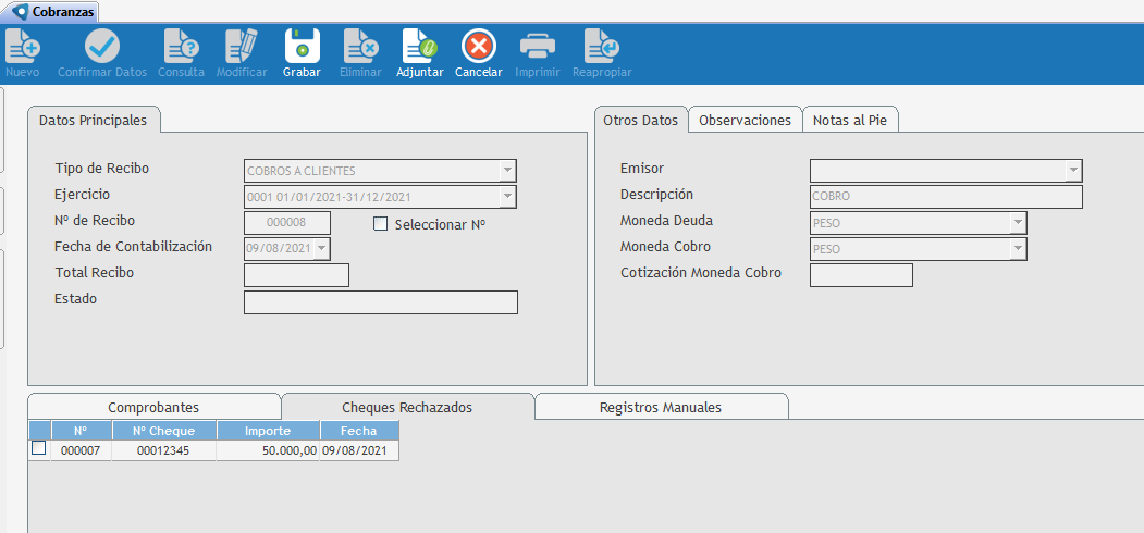 Importante: incorpora, en forma automática, la fecha en que se accede a la opción como la fecha del rechazo, la misma se puede modificar, pero se debe tener en cuenta que va a efectuar el movimiento contable con la fecha que se defina.