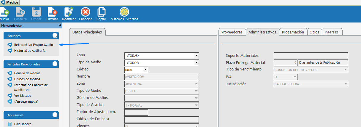 Esta opción permite ingresar los distintos Medios que se definen como una entidad que recibe Órdenes de Publicidad con instrucciones precisas acerca del momento, el lugar y las características de los avisos que se desean publicar.