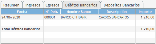 Para ver la información se debe presionar el botón Iniciar. Luego, se visualizará una solapa de resultado con las cuentas de Tesorería, un saldo al inicio de la fecha Desde seleccionada, Movimientos de Ingresos, de Egresos, de Depósitos, Ajustes del rango de fechas seleccionadas y un Disponible a la fecha. ![]()