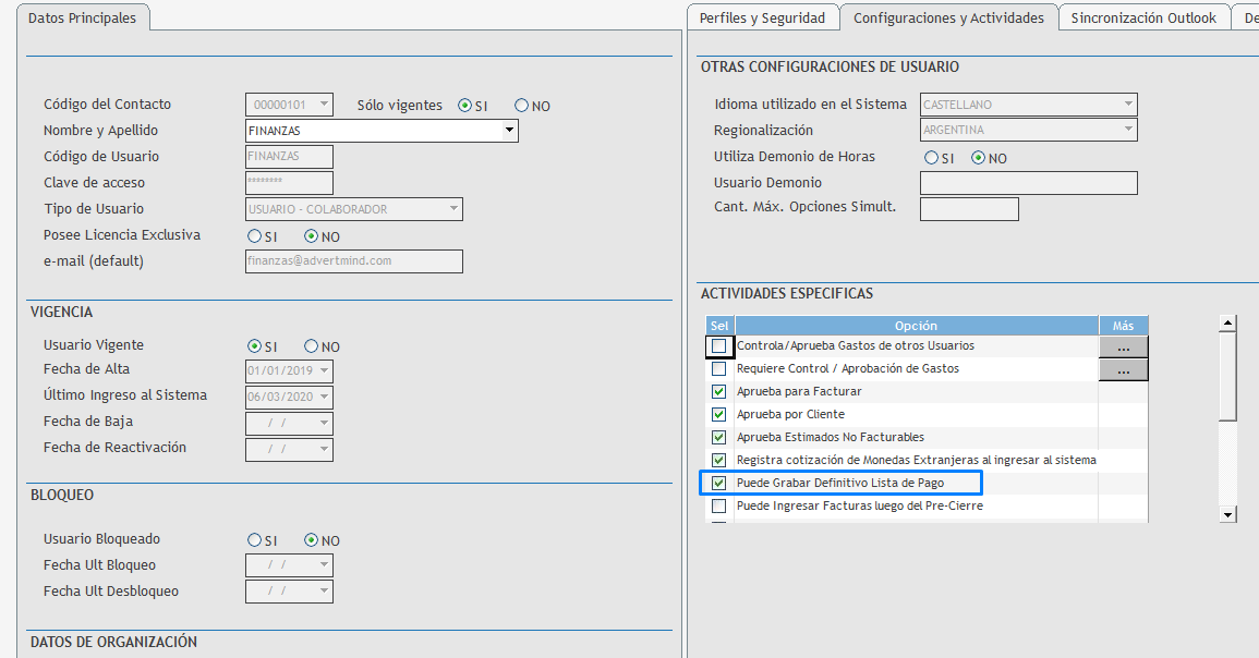 El usuario que tiene a cargo la aprobación del listado debe tener el permiso necesario para poder hacerlo, dentro de las configuraciones del usuario, se debe habilitar el permiso de grabar en forma definitiva la lista. ![]() |