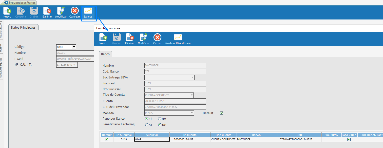 ![]() Con el proveedor registrado se habilita, sobre la parte superior, el botón Banco, al presionarlo abre una nueva ventana donde permite indicar una o varias cuentas bancarias e indicar cuál será, por defecto, y cuál puede ser utilizada para Generar Lista de Pago por Banco. Al presionar el botón Nuevo, en la Solapa Banco, habilita los campos donde se debe indicar el nombre del banco, el código de la cuenta, la sucursal, el tipo de cuenta, su número y la moneda. |