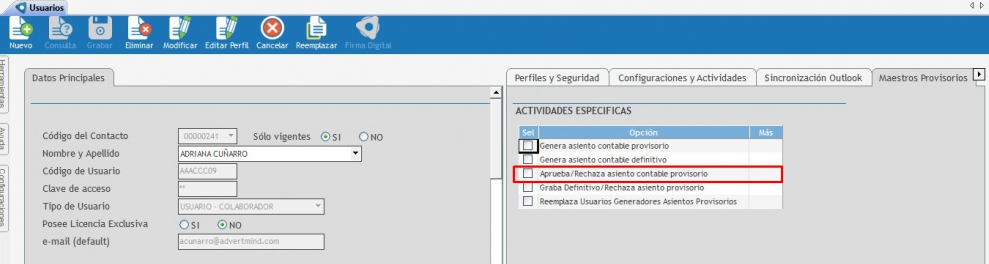 Para esta explicación se configura el usuario que podrá Aprobar o Rechazar los asientos provisorios pero, no podrá grabarlos como Definitivos, esto quiere decir que no tendrá la posibilidad de generar la contabilización.