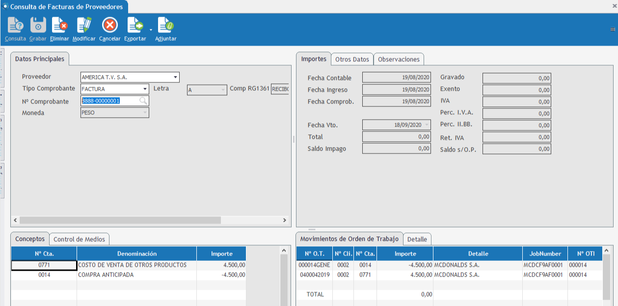 El proveedor envía una factura por el valor de la compra anticipada y se procede al ingreso de la misma a través de la opción Control y registración de facturas recibidas. Se debe seleccionar el Tipo de Carga: Ingreso Manual de Factura de Medios, esto habilita, en la solapa Budget Control, la opción Compra Anticipada, donde se podrá indicar que corresponde a una factura de compra anticipada. ![]() Luego, en el campo Medio se visualiza una nueva opción donde permite indicar para qué medios relacionados se va a utilizar la Factura, permitiendo, por defecto, seleccionar todos los medios que tiene asociados el Proveedor ![]() La registración de la factura se efectúa de igual modo que las facturas manuales. Se debe cargar el JobNumber, la Orden de trabajo, Cuenta de IVA y en la sección de Resumen se indica el total de la factura. Se permite ingresar el JobNumber genérico de la Agencia y la OT genérica para registrar el pago anticipado que se va a realizar al proveedor, dado que, en forma posterior, cuando se apliquen las siguientes facturas con el consumo se va a descontar de la compran anticipada y se reflejará en el JobNumber y la OT correspondiente. ![]() Cuando se consulta la factura que se ha ingresado, se puede ver la imputación contable efectuada. ![]()