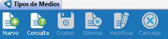 ![]() A través de la Consulta permite la búsqueda de un tipo de medio específico para su actualización con el botón Modificar, luego de efectuada se debe registrar el cambio con el botón Grabar. Con el botón Eliminar permite borrar el Tipo de medio siempre y cuando no haya sido asignado. Cancelar permite finalizar la acción que se está efectuando en ese instante. |