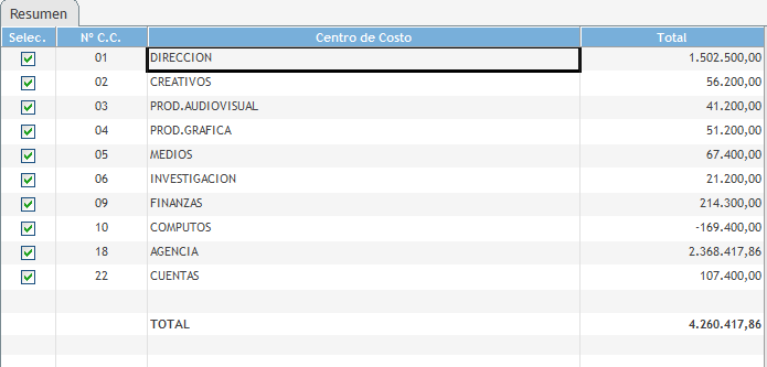 Sobre el reporte, dependiendo de los filtros utilizados, se puede consultar, por ejemplo, el centro de costos de nuestro interés. Haciendo clic con el mouse sobre el nombre del centro a consultar, se abre una nueva ventana que muestra la apertura por centro de costo.