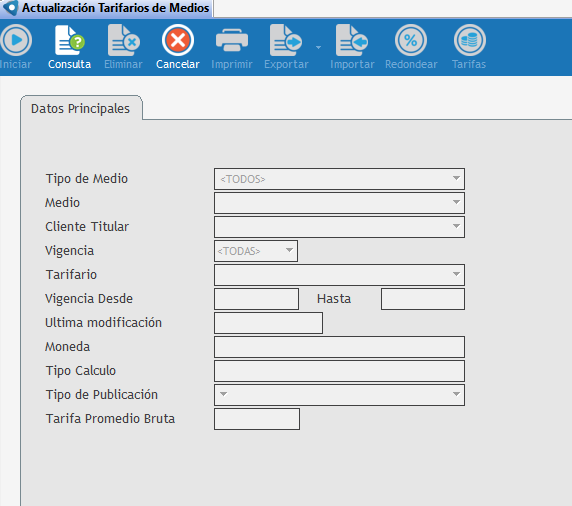 En esta pantalla se visualizan y modifican los Tarifarios, los cuales dependiendo del país y el proveedor de medios pueden ser importados a través de rutinas, que permiten la actualización de los programas y tarifas en forma periódica.