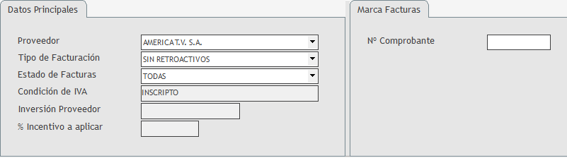 Proveedor: muestra todos aquellos Proveedores que cumplan con las condiciones requeridas para poder facturarles incentivos. Tipo Facturación: seleccionar el tipo de facturación que indica qué cálculo se hará: •Sin Retroactivos: la escala alcanzada para calcular la bonificación solo sobre facturas que no hayan sido incluidas en otras facturas de incentivos. •Solo Retroactivos: la escala alcanzada se calcula solo sobre las facturas que ya hayan tenido una factura de incentivos. •Incluye Retroactivos: la escala alcanzada a toda inversión acumulada total de las facturas seleccionadas. Estado de Facturación: permite filtrar las facturas del proveedor de acuerdo a su estado de pago. Permite seleccionar: •Todas: se incluyen todas las facturas contabilizadas del proveedor sin importar el estado de pago de estas. •Pagadas: solo se mostraran, para su selección, las facturas del proveedor que se encuentren pagadas en su totalidad. •No Pagadas: solo se mostraran, para su selección, las facturas del proveedor que se encuentren totalmente impagas. Condición de IVA: se expone la condición de IVA ingresado en el Maestro de Clientes de Facturación. Inversión Proveedor: se completa automáticamente luego de presionar el botón Confirmar. Sirve para mostrar monto de inversión alcanzado por el Proveedor. % Incentivo a Aplicar: se completa automáticamente luego de Confirmar. Sirve para indicar cuál es el porcentaje de bonificación a calcular de acuerdo al tramo de la escala alcanzado por la inversión en el Proveedor. ![]() Por otro lado, se debe determinar la sucursal (fiscalmente es el punto de venta) con la que se va a emitir el comprobante. Es parte del número del comprobante. En el caso de los países que no utilizan sucursales, la factura se genera con la sucursal 00 más el número de la factura. También permite definir si se desea emitir la factura sin efectuar retenciones. Para la selección debemos elegir el período en el cual fueron generadas las ordenes de publicidad y entre qué fechas fueron recibidas y registradas las facturas del proveedor, ambas selecciones permiten filtrar la información a exponer. Para ver la información que cumple con los filtros debemos presionar el botón Seleccionar, esto expone un listado con el total de la inversión del proveedor y el porcentaje de comisión correspondiente según la escala creada, la misma se puede aplicar a una o mas facturas ingresadas.