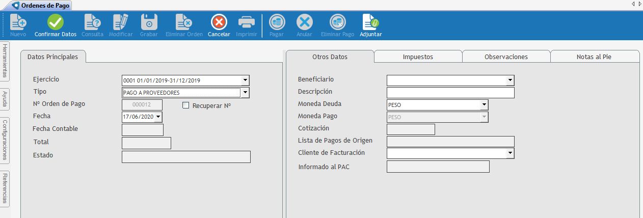 Se deben crear los siguientes Maestros: 1.Si se desea emitir una orden de pago a un Proveedores debe existir en el maestro y si se quiere abonar una factura, debe estar ingresada en el sistema. a.Dependiendo de la situación impositiva de la agencia, se debe validar el maestro o hacer las actualizaciones correspondientes. 2.Si se desea emitir una orden de pago a un Clientes de Facturación debe existir en el maestro, adicionalmente, debe tener ingresada una NC o haber entregado un anticipo para poder emitir la orden de pago. 3.En el caso de Pagos varios deben existir las Cuentas Contables a donde se desea imputar. 4.Actualizado los maestros de proveedores para el cálculo de retenciones, ganancias, IVA, contribución publicitaria. |