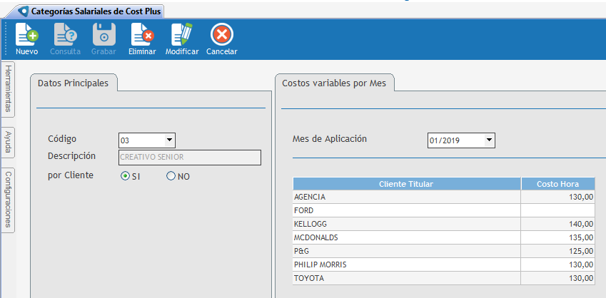 En esta opción se definen las Categorías Salariales de Cost Plus que posee la organización.