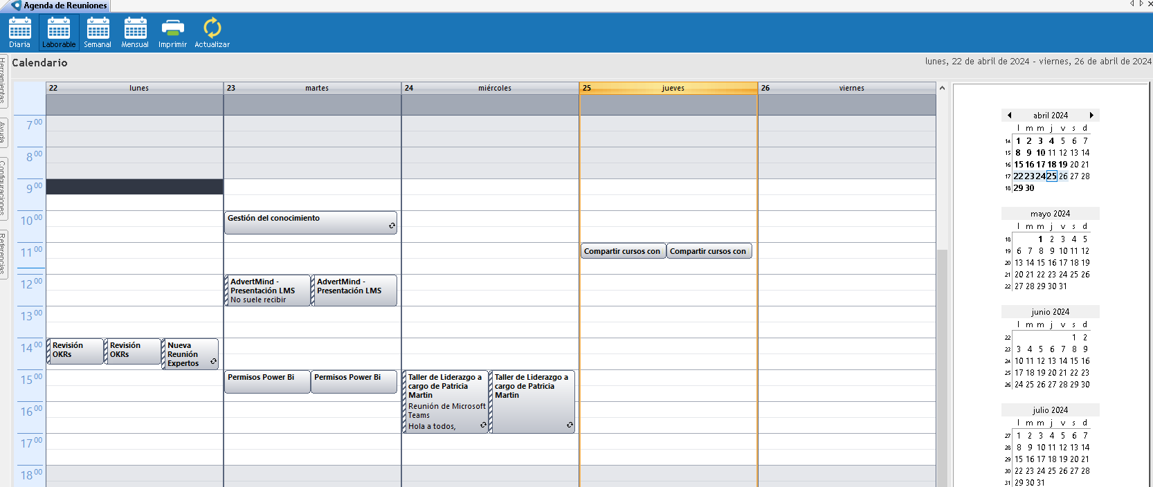 ![]() La agenda se expone con las reuniones que tenemos definida, en nuestro calendario ejemplo Outlook. Para agendar una nueva reunión tenemos dos opciones una vez seleccionada la fecha y el horario: 1.Presionando doble clic sobre la fecha abre un nuevo evento. ![]() 2.Presionar botón derecho del mouse: se muestra dos opciones a elegir: ![]() a.Nuevo Evento expone la misma ventana que el caso previo. b.Nuevo Vencimiento Fiscal a diferencia del evento normal sugerimos utilizarlo para acciones que se deben efectuar durante el día, es a temporal, ejemplo vencimiento de un impuesto. ![]() |