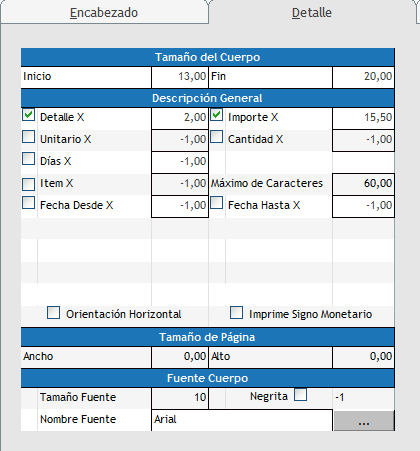 •En esta sección se define donde comienza y termina el cuerpo en inicio y fin, entendiendo que estamos hablando del eje Y donde en la imagen se muestra, que comienza a 13 cm del borde superior de la hoja y finaliza a los 20 cm, se debe tener en cuenta que si el texto de la orden de compra es extenso, al llegar a los 20 cm va a efectuar un salto de página y va a continuar en una nueva hoja, dejando espacio para exponer los totales. •Por otro lado, permite definir el tamaño de la página que por defecto viene deshabilitado pero permite establecerla, si la deja deshabilitada toma por defecto la configuración definida en la impresora, caso contrario se debe definir el tamaño y ajustar en la impresora. Descripción general