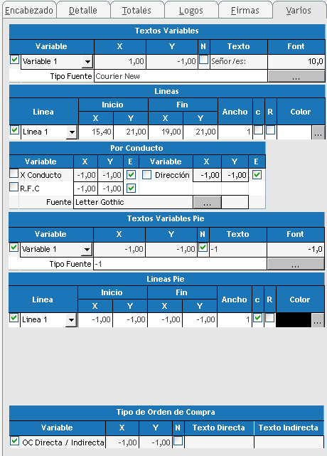 Se van a visualizar en las distintas solapas unas columnas que tienen una referencia de X e Y que identifican un punto de referencia para la ubicación de la variable en el diseño de las ordenes de compra, si una variable se encuentras con los valor -1 indica que NO tiene una referencia y por lo cual no va a salir impresa.