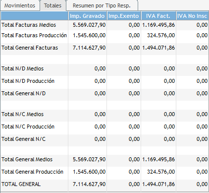 Una vez seleccionados los filtros se presiona el botón Iniciar para ver la información en la Solapa Movimientos. Allí se detalla cada una de las facturas emitidas para los clientes. En la Solapa Totales se ven los totales agrupado por Facturas de Medios y Producción, separando las Notas de Débito de Medios y Producción. Por último, las Notas de Crédito de Medios y Producción, Total General de Medios y de Producción y el Total General del listado.
