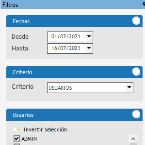 ![]() Fechas Se debe seleccionar el período de análisis, sugerimos efectuar los análisis en forma mensual para evaluar la mejora en el uso. Criterios En el criterio permite analizarlo por usuario o por departamento. Usuarios / departamento Brinda un listado y permite seleccionar uno en particular o ver todos. |