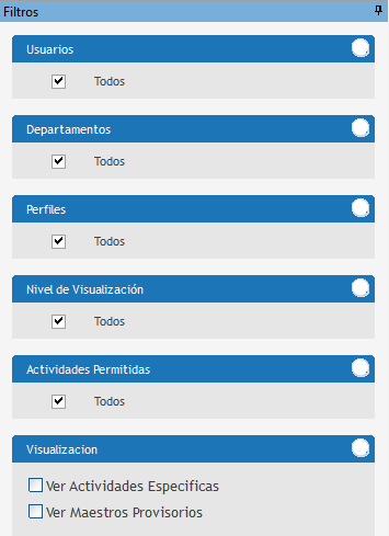 ![]() Usuarios Por defecto se expone el listado con todos los usuarios, si se destilda permite seleccionar los necesarios, se va a visualizar el nombre completo para mejor entendimiento. Departamentos Por defecto se expone el listado con todos los departamento permitiendo al des seleccionar uno en particular. Perfiles Por defecto se expone el listado con todos los perfiles y permite des seleccionar para elegir uno o varios en particular. Nivel de Visualización Muestra todos los estados, solo se visualizan las letras para ver la referencia sugiero ver el apartado de nivel de visualización, que indica cuales permiten ver costos y cuales no. Es común en una agencia que determinados perfiles no puedan ver el costo, ya que en vez de tratar de lograr un mejor utilidad comienzan a operar a a favor de los proveedores, de esta manera no pueden conocer cual es el costo acordado tanto en el presupuesto como en los planes. Actividades permitidas Hace referencia a si sobre una opción del sistema que permisos tiene el usuario, alta, baja, modificación, etc. Visualización Si se seleccionar ver actividades específicas, el detalle se va a exponer en una solapa adicional, con las actividades que el usuario tiene disponible. Al seleccionar ver maestros provisorios, también se va a visualizar en una solapa adicional indicando que acciones tiene derecho en cada maestro provisorio. |
