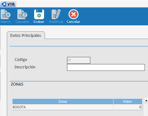![]() Datos Principales El código es asignado por el sistema una vez que se ingresa el nuevo VTR. En la Descripción permite el ingreso de un texto que identifique el impuesto ingresado. Zonas Esta sección está compuesta por una lista con las todas las zonas y permite ingresar el valor que se les aplicará el VTR consultado. |