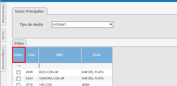 1.En primer lugar, se debe seleccionar un Rankings de Medios (obligatorio) donde se define cómo se obtienen los datos de rating. Esto puede hacerse de dos maneras: o con Book: cuando queremos obtener datos de medición de rating de diferentes proveedores. oo sin Book: cuando no es necesario tener datos de medición para comenzar la planificación. ![]() 2.Una vez que se define si lleva o no rating, se va a abrir una nueva ventana, "Captura de Rankings", donde se podrá seleccionar del listado de medios en los cuales se podrá planificar. El sistema, con el fin de facilitar la búsqueda de los Tipos de medio, muestra un combo donde se podrá realizar una búsqueda manual. En este momento se debe seleccionar, cada medio o, si se necesita tener todos los medios, presionamos sobre el nombre de la columna Selección (en la grilla "Sitios"), para seleccionar todos. ![]()