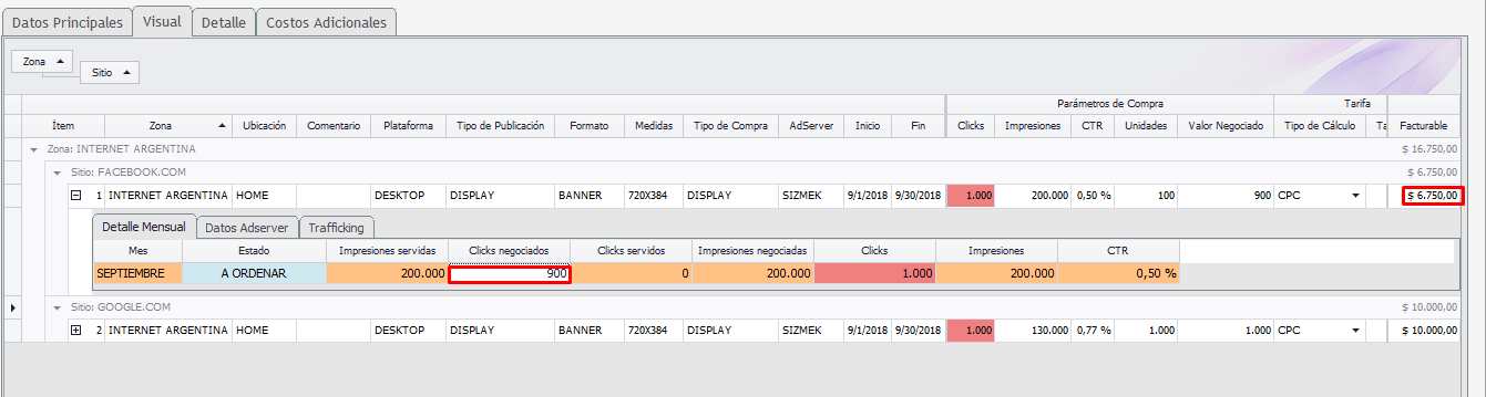 1.Para generar la actualización es necesario que el plan este ordenado en forma obligatoria. 2.Depende del tipo de compra utilizada en la planificación. En este caso, como ejemplo, contratamos CPC y el dato real a actualizar son los click negociados. ![]() 3.Al cambiar la cantidad de clicks negociados se actualiza la tarifa final con los clicks reales de la venta y la compra. ![]()