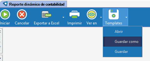 Importante: antes de pasar a buscar los filtros, sugerimos guardar la selección de campos efectuada, ya que esto permite, luego, revisar si la información que se seleccionó es correcta o se deben incorporar nuevos campos. Para esto se debe utilizar la opción de Templates, que se encuentra en la parte superior de la pantalla. ![]() Al guardar el reporte, solicita indicar un nombre, que nos servirá de referencia para identificar al reporte utilizado. ![]()